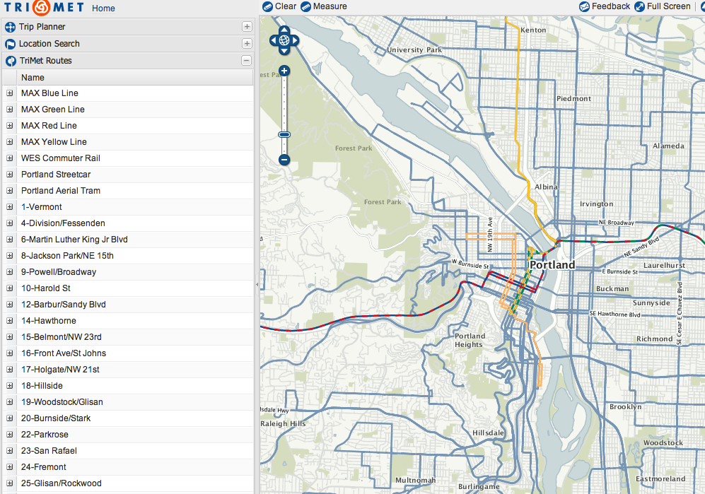 The city of Portland uses GeoServer in their transportation authority called TriMet. If you go to the TriMet site - TriMet, you’ll see a map of the Portland transportation network, with all the routes and stops, and that stuff on it. And it also comes with trip planner, where you put in a source and destination where you want to go, and the route is calculated and displayed on a map. That all comes with GeoServer on the back end.