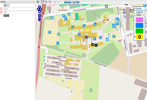 The Alpen Adria Universität Klagenfurt (University of Klagenfurt, Austria) Campus GIS application provides indoor routing services for students, guests and staff. Users enter a start/end room and the application calculates a route through the campus, including through different floors of buildings, and with optional wheelchair accessibility. Built by a professor at the university (via the consulting firm GOMOGI), it was designed to combat the problem of new students being late to class due to becoming lost on campus. This application uses PostGIS, GeoServer, GeoWebCache, OpenLayers, and GeoExt, and uses PGrouting for the routing algorithm.