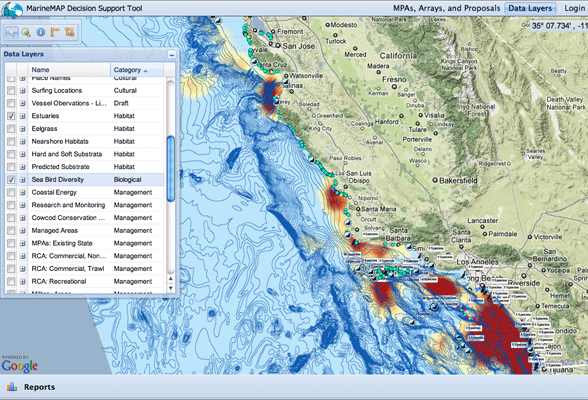The MarineMap Decision Support Tool is an online mapping tool developed to assist in the design of marine protected areas (MPAs) in the Marine Life Protection Act Initiative process. Developed by Farallon Geographics, an OpenGeo partner, this application users GeoServer in combination with Google Maps, and as well offers read/write functionality using WFS-T (transactions).
