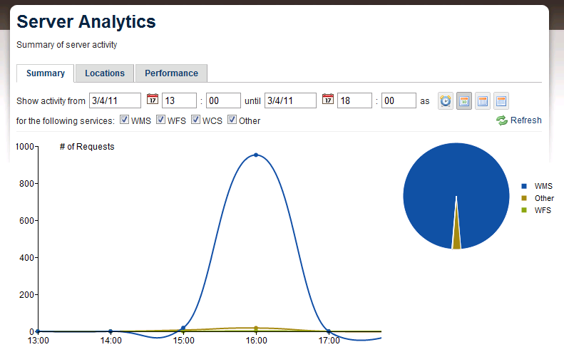 Suite Analytics allows server administrators to view performance metrics and server statistics graphically. Integrated with the GeoServer web administration interface, Suite Analytics analyzes and aggregates the requests to GeoServer and displays them on easy-to-understand graphs and integrated maps.
