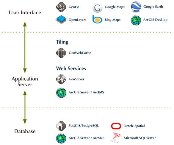 Want to break out of the silo? The OpenGeo Suite integrates with your existing infrastructure while speaking open standards and interoperating seamlessly with Google Earth and Maps. We emphasize a hybrid architecture that lets you swap in open source components where it's most appropriate.