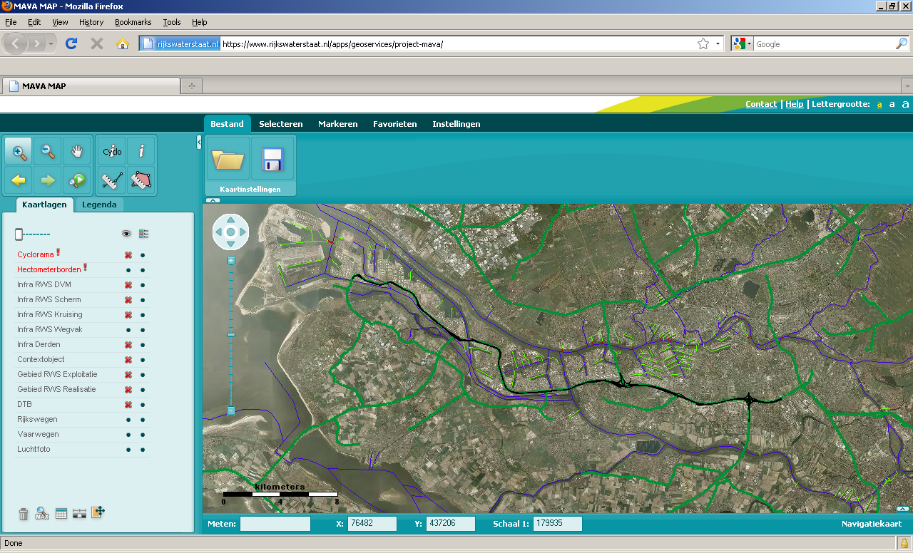 Rijkswaterstaat publishes an internal map of its infrastructure database via the MapViewer application, which provides access to over more than 250 layers of spatial information to the 12000 employees of Rijkswaterstaat. The 1.0 version of MapViewer was built with open source components (MapServer and Chameleon), and provided web access to capabilities that were previously only available via desktop GIS applications.